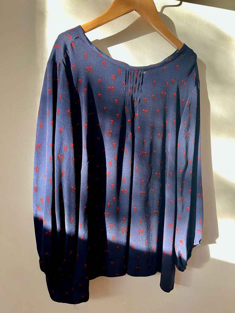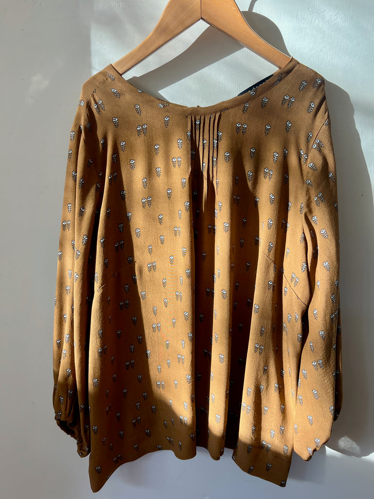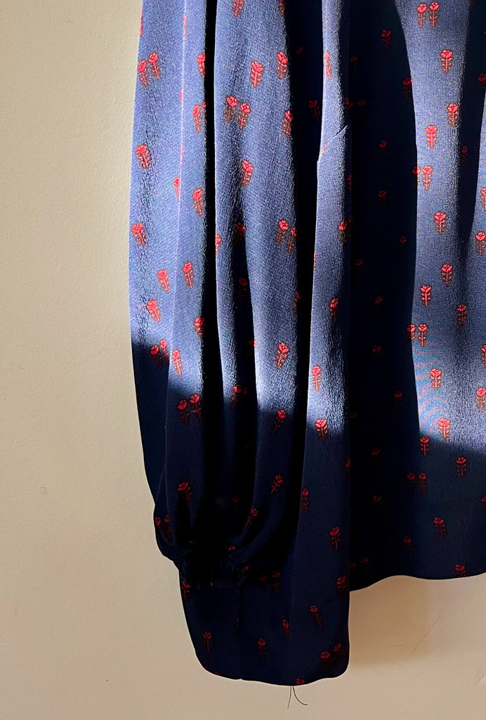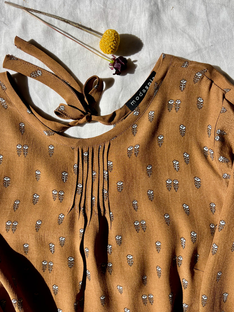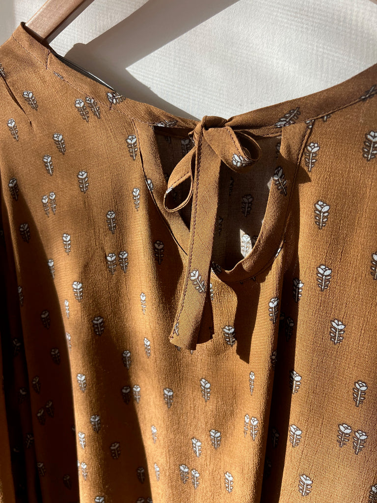 the pintuck in a lovely tiny flower print. available in golend brown or deep navy. slinky blouse with charming vintage details like pintucks and a keyhole in back with long ties.  boxy through the middle and fitted through the shoulders. french seams. made to order in placerville, ca.   ready to ship.