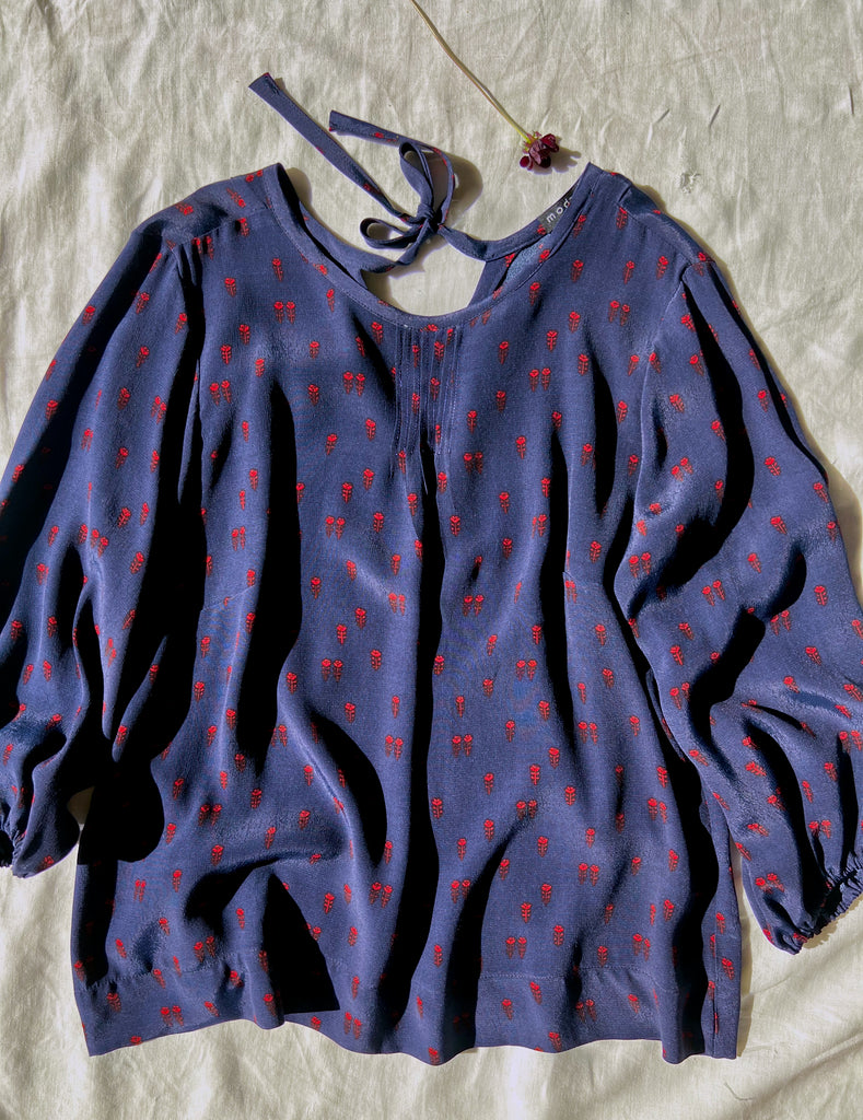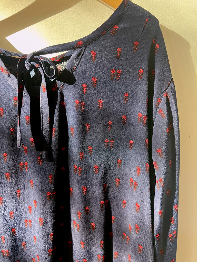 the pintuck in a deep navy w tiny red flower print. slinky blouse with charming vintage details like pintucks and a keyhole in back with long ties. boxy through the middle and fitted through the shoulders. french seams. made to order in placerville, ca. please allow up to 6 weeks shipping.